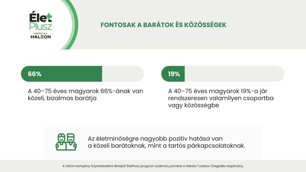 A 40–75 évesek körében a baráti kapcsolatok – a párkapcsolatoknál is erősebben – befolyásolják az életminőséget: akinek van bizalmas barátja, általában jobban érzi magát, elégedettebb az életével. Bár a korosztály kétharmadának van ilyen közeli kapcsolata, a rendszeres közösségi részvétel már kevesekre jellemző: nagyobb közösségbe csupán minden ötödik ember jár el. Így bár a közösségi kapcsolatok védő szerepe egyértelmű, a szervezett programokon való részvétel alacsony – miközben az igény messze nagyobb: a megkérdezettek háromnegyede szívesen csatlakozna valamilyen helyi közösségi programhoz, ha az elérhető lenne számára.